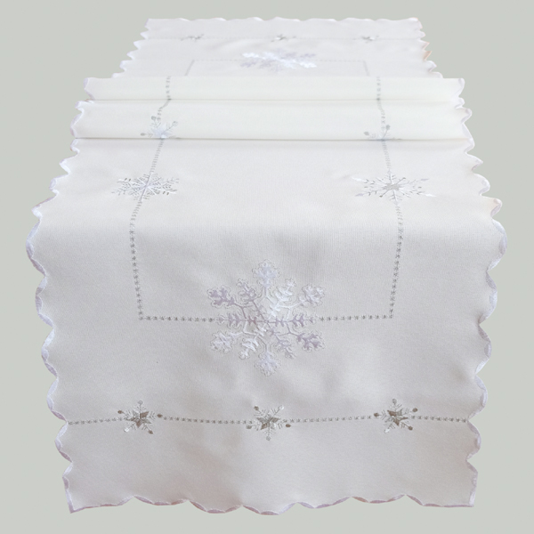 Weihnachtlicher Tischläufer in weiß-silber mit Stickerei Schneesterne. Der Tischläufer hat einen wellenförmigen Saum und ist bestickt mit Schneesternen. Erhältlich ist der Tischläufer in der Größe 40x140 cm.