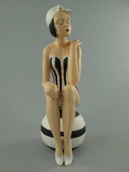 Trendy Dekofigur Badenixe, Badepuppe im Retro Stil als kleiner eyecatcher auf Regalen oder Schränken. Die Badenixe ist ca. 38 cm hoch, aus Polystein und posiert lässig sitzend gestreiftem Vintage Badeanzug auf einem Ball.