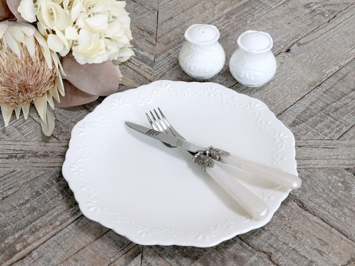 Edles Besteck Set im französischen Landhaus Stil aus der Landhaus Besteck Serie Linas von Chic Antique. Das Besteck Set mit silberfarbene Verzierung und perlmutt farbenen Kunststoffgriffen gibt es wahleise für 1 Person oder für 4 Personen.