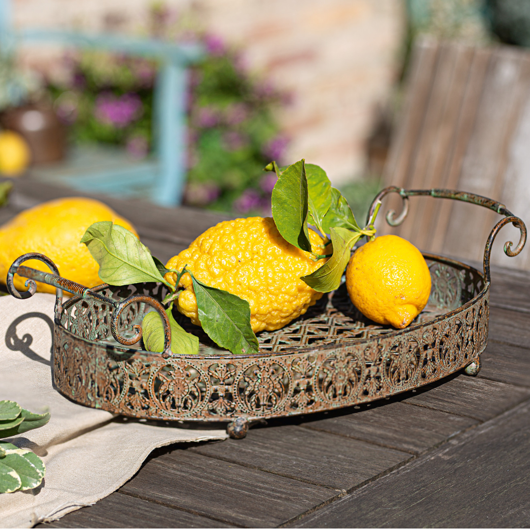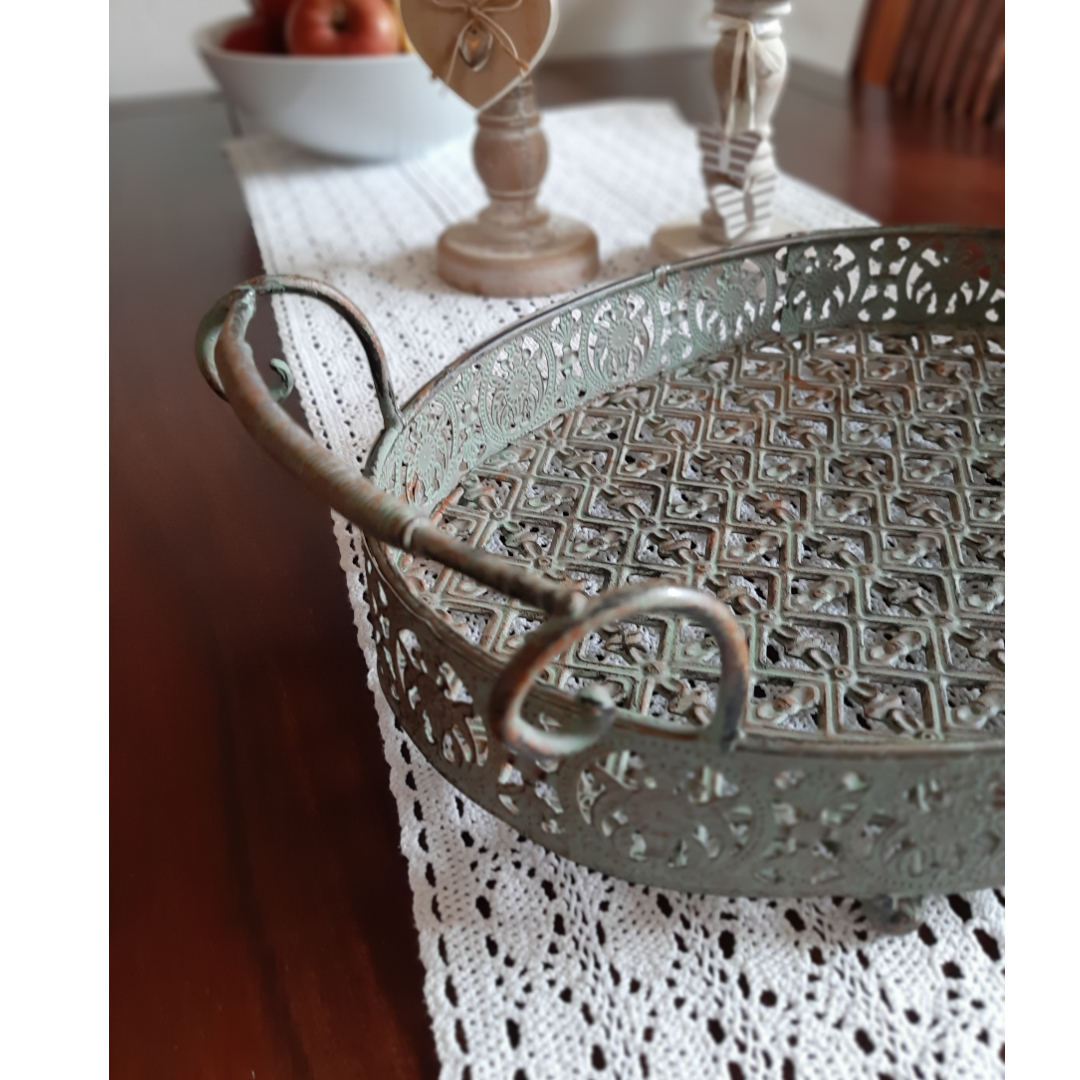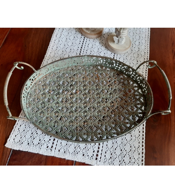 Deko Tablett aus Metall im Landhaus Stil, Shabby Chic Look. Das Tablett hat eine trendige Rostoptik mit mintgrüner Patina, dekorative Ausstanzungen und seitliche Griffe.