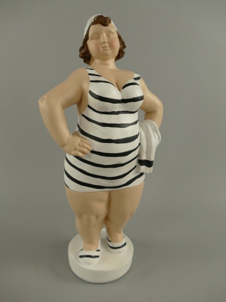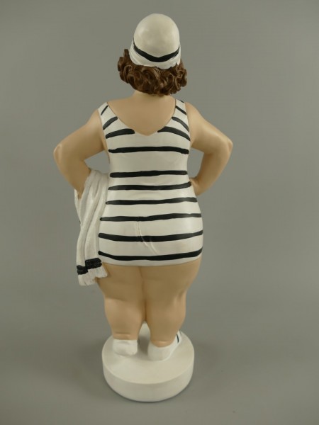 Trendy Dekofigur dicke Badenixe Badepuppe im Retro Stil als kleiner eyecatcher im Bad, auf Regalen oder Schränken. Die dicke Badenixe ist aus Polystein ist ca. 40 cm hoch.Stehend posiert sie im blau weiß gestreiften Badeanzug.