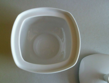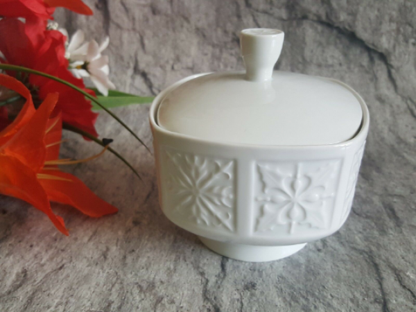 Große Zuckerdose aus Porzellan in weiß, eckige Form und Relief Muster der Marke Edelstein, verm. 70er Jahre.