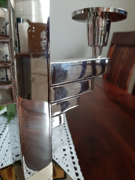 Nostalgischer Kerzenständer Kerzenleuchter Leuchter 3-flammig im Art Deco Stil. Der mehrarmige Kerzenständer aus vernickeltem Aluminium hat eine Höhe von 33 cm. Die kantige Form des Kerzenleuchters, die typisch ist für die Art Deco Zeit, wirkt sehr modern und so ist der Leuchter ein tolles Wohnaccessoire in einem modernen Wohnraum. Auf den Halterungen passen sowohl Stabkerzen als auch kleine Teelichte.