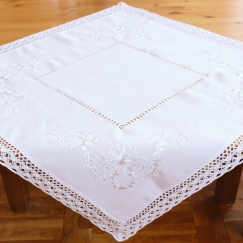 Mitteldecke, Tischdecke im Landhausstil mit Hohlsaum, Stickerei und Häkelspitze in wollweiß. Die Mitteldecke hat die Maße 85 x 85 und ist aus 100% Polyester. Waschbar ist die Mitteldecke bis 30°.
