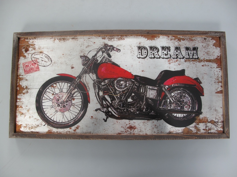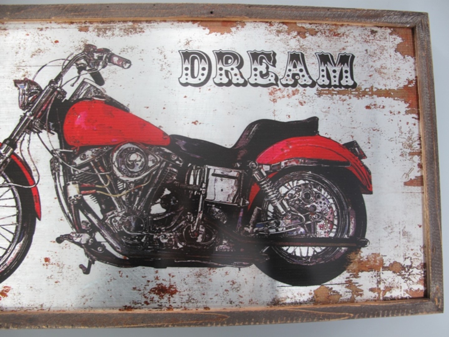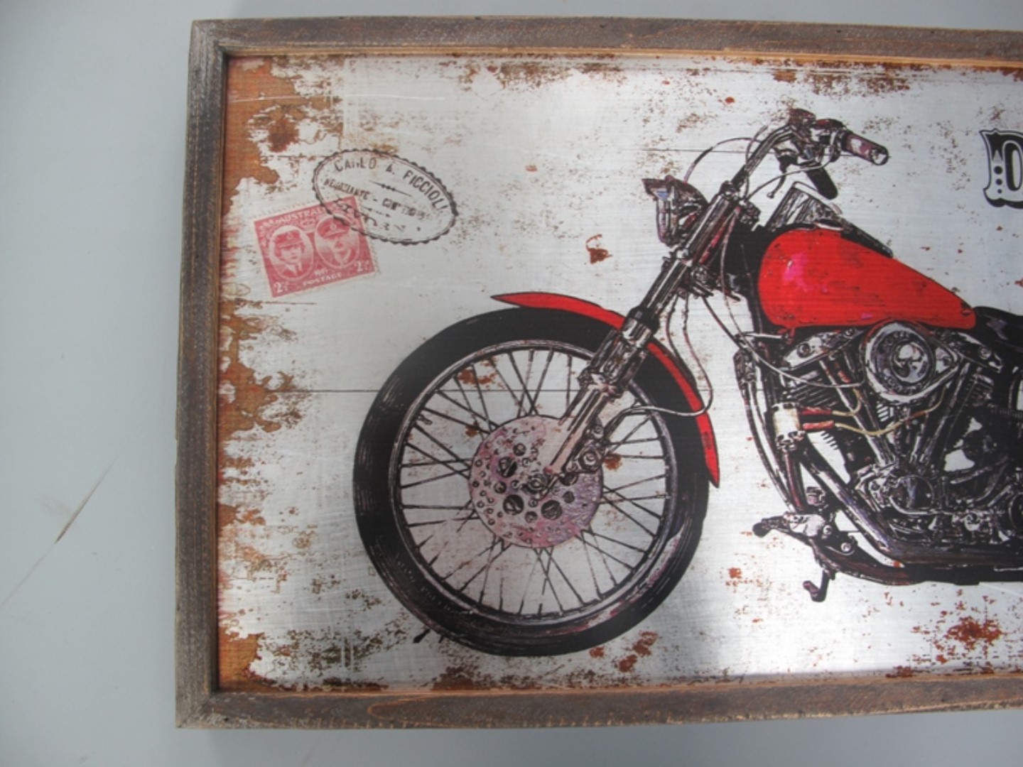 Wandbild Motiv Motorrad mit Holzrahmen im Vintage Look. Das Wandbild hat eine Länge von 80 cm und ist eine tolle Dekoration für den Eingangsbereich oder einen Wohnraum.