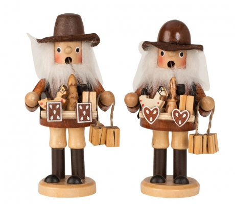 Dekoratives Räuchermännchen für Weihnachten. Das Räuchermännchen ist ca. 15,5 cm groß und hat einen kleinen Bauchladen, vorne dekoriert mit Lebkuchen. Einmal hat das Räuchermännchen vorne Sterne und einmal Lebkuchen in Herzform. Das Modell ist wählbar.