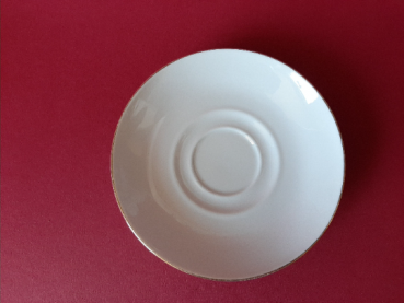 Vintage Kaffeetasse und Unterteller der Marke Thomas - Entwurf Tapio Wirkkala, Porzellan in weiß mit zartem Goldrand an Tasse und Teller ca. 50er/60er Jahre