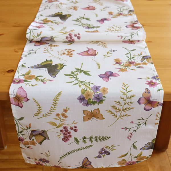 Sommerlicher Tischläufer mit modernem Textildruck Motiv Schmetterlinge. Der Tischläufer mit den Maßen 40 x 140 cm ist aus 100% Polyester.
