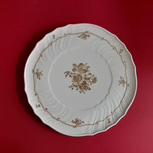 Elegante Tortenplatte, Kuchenplatte der Marke Hutschenreuther aus der Porzellan Serie Dresden Meersburg. Mit dem geschwungenen Rand, dem Relief und dem hübschen Dekor, welches mit edel goldschimmernden Ranken verziert ist, macht die Tortenplatte eine Kaffeetafel perfekt.