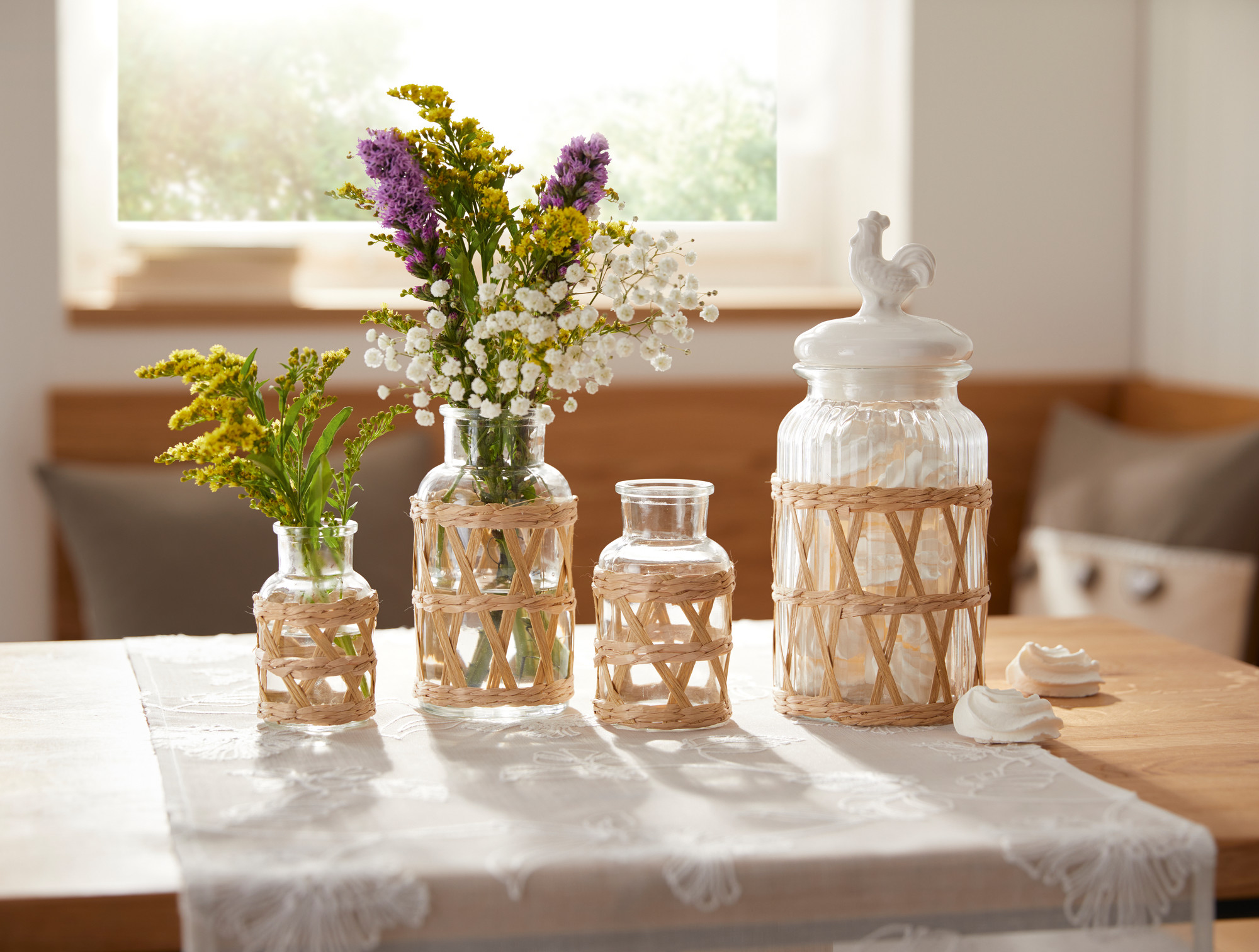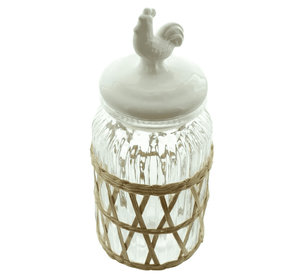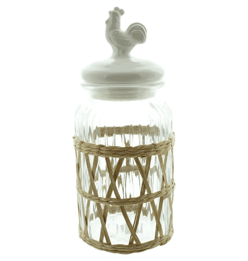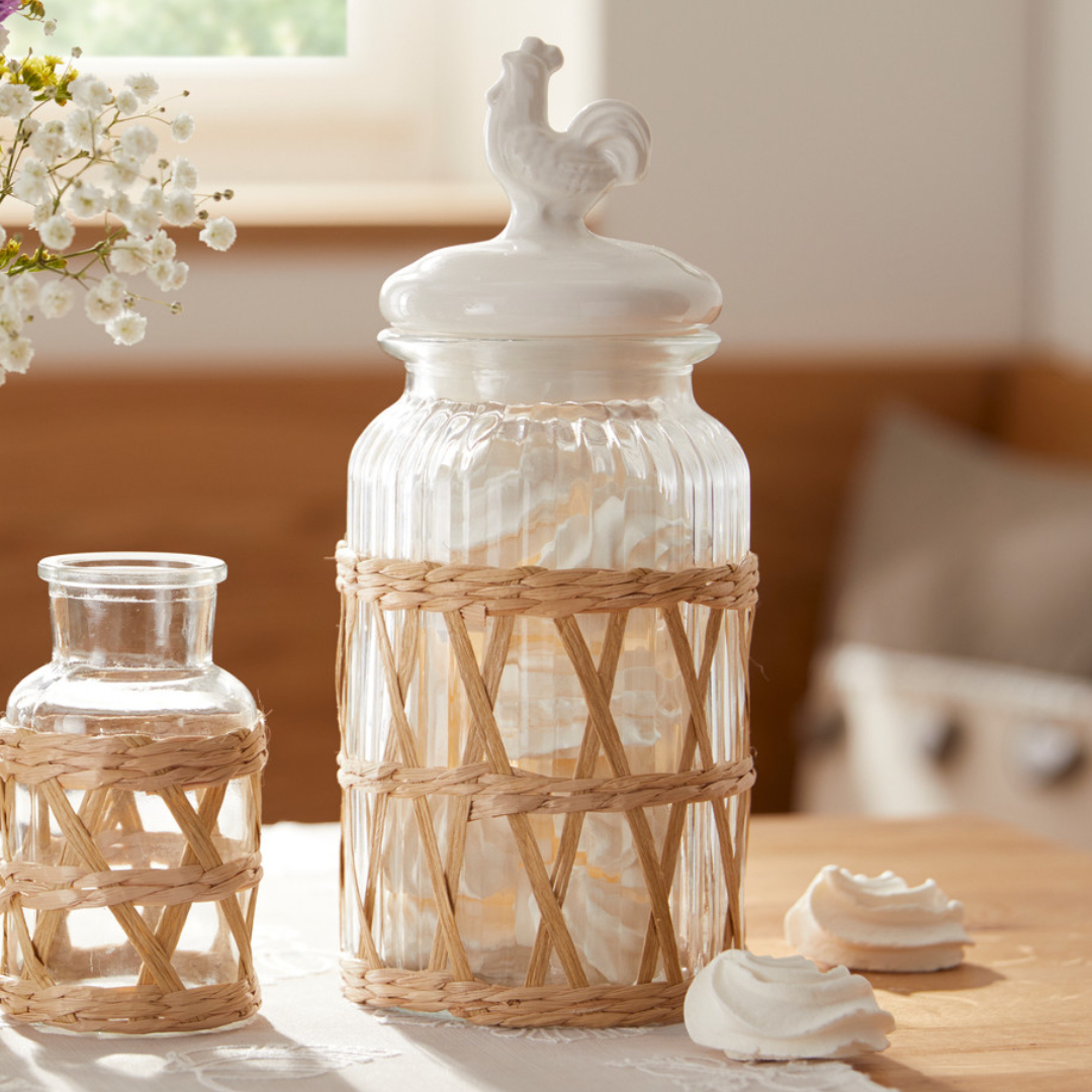 Vorratsglas Landhaus - Glas mit cremeweißen Keramikdeckel und dekorativen naturfarbenem Strohgeflecht.